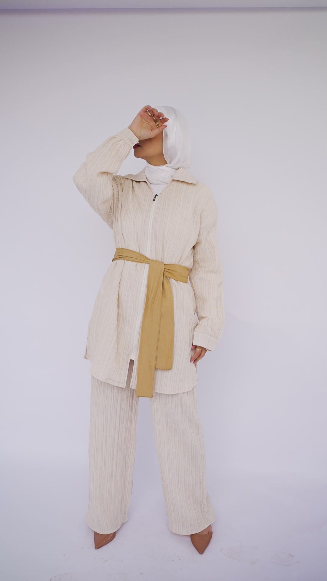 Linen Luxe Set offers a poised take on summer elegance, merging breathable comfort with polished simplicity. Woven from a cotton-linen blend, the kaftan’s soft drape is complemented by a coordinating belt, allowing fluid styling across beach evenings, Eid brunches, or everyday leisure. Available in black, beige, and blue, each color delivers an understated impact while ensuring modest coverage. Designed in a free-size silhouette, it’s a seamless addition to refined womens sets catering to light layering and timeless grace. Within our edit of contemporary sets for women, this ensemble stands out for its quiet luxury and effortless charm.
