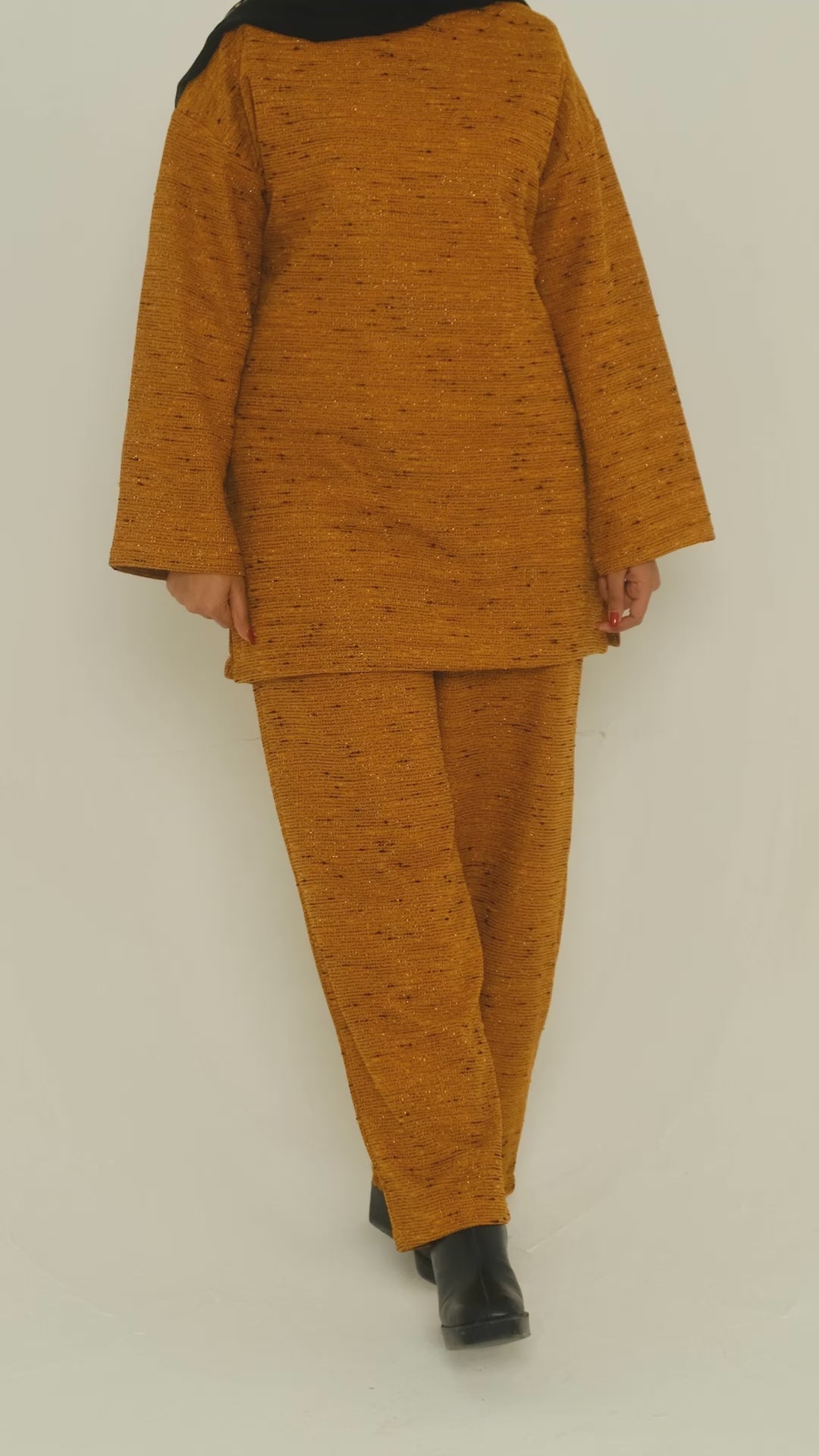Elevating winter basics with texture and charm, the Shiny Tweed Set brings cozy sophistication to our collection of womens sets. Crafted from soft tweed in mustard or olive, this two-piece ensemble features a relaxed top and coordinating trousers designed for modest comfort and seasonal style. Its structured fabric adds subtle polish, making it ideal for casual outings or layered festive looks. A versatile staple among refined sets for women, it blends warmth, ease, and understated elegance in one cohesive silhouette. Find more expressive silhouettes inside our Autumn-Winter Collection.